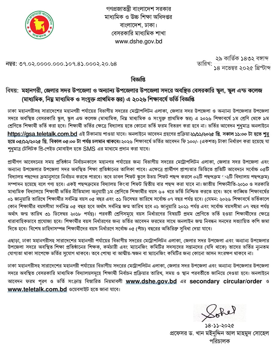 The application has been concluded online and the findings have been released online. On the gsa.teletalk.com.bd and on the school notice board, the merits list and the waiting list were released.